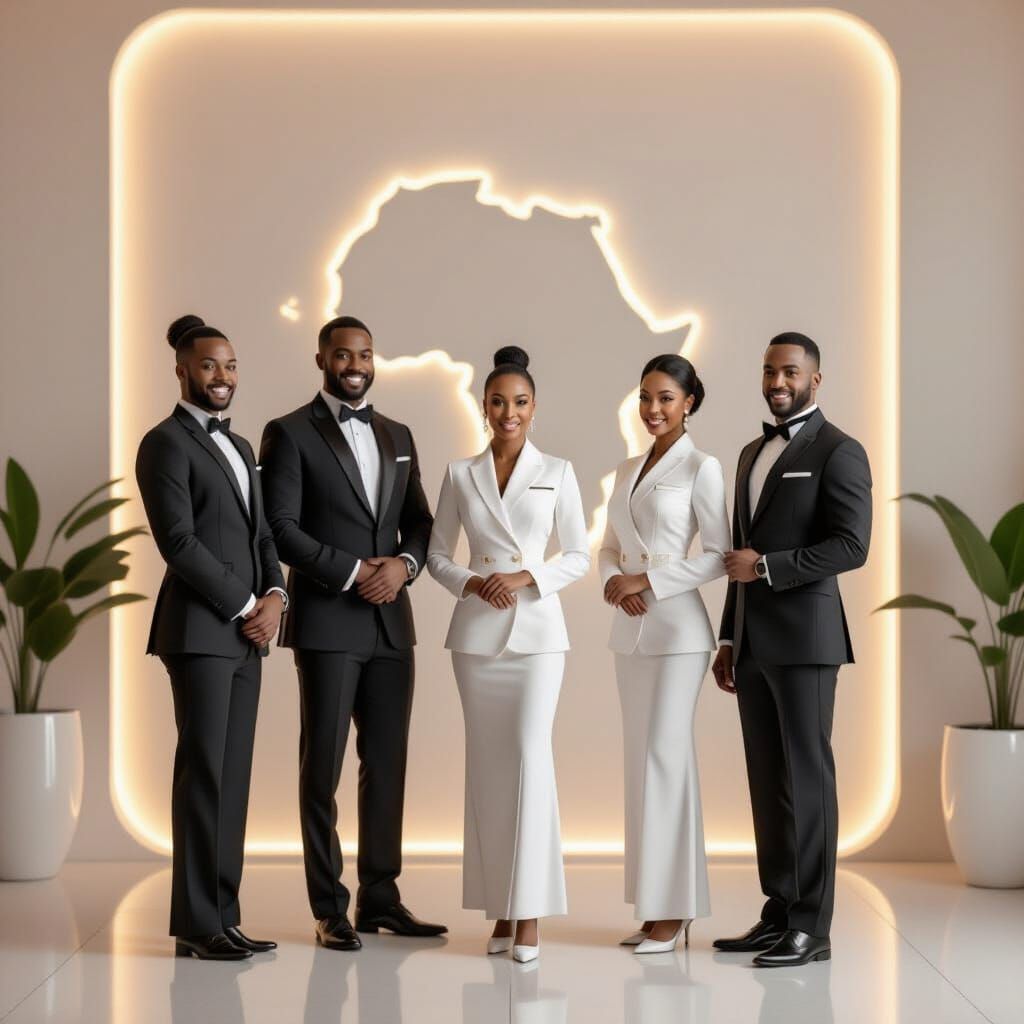 This image shows a sophisticated spa beauty team in elegant uniforms, striking confident poses. The scene features a subtle African continent outline and a futuristic luxury branding style, presented as realistic 8K photography.