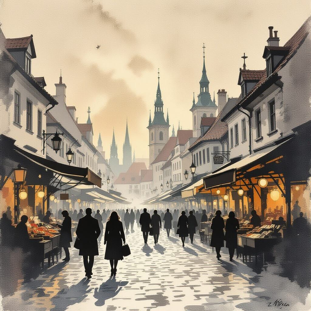 This image shows a bustling vintage European marketplace with silhouetted figures. The artwork is rendered as a muted ink wash painting with a warm earth tone palette and a surprisingly vibrant background.