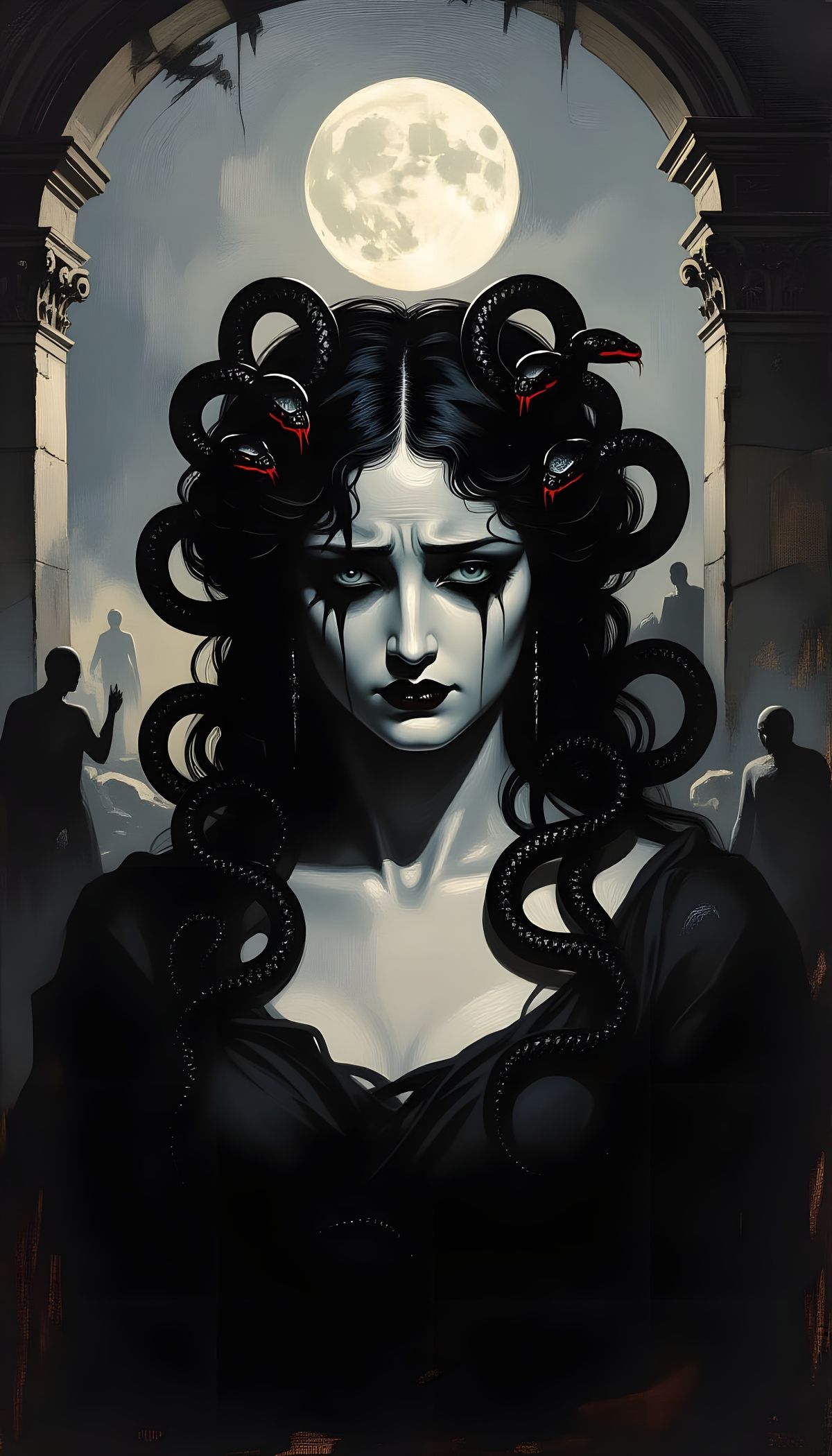 This image shows a haunting Gorgon in a ruined temple. The scene is dominated by deep shadows and faint moonlight, with writhing snakes and ghostly figures, rendered as an oil painting.
