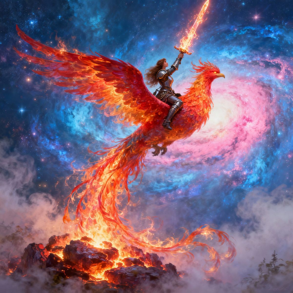 A majestic phoenix with fiery tail feathers ascends from glowing embers, carrying a warrior in medieval gear. The scene features a swirling nebula and a luminous, magical atmosphere.