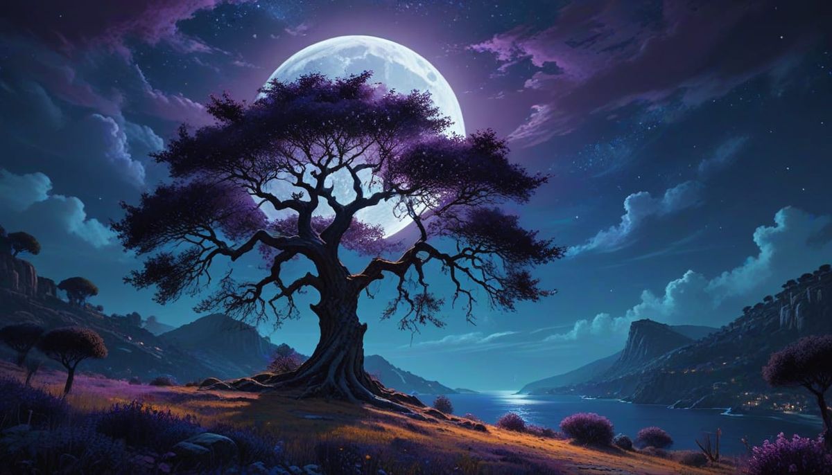 A serene moonlit night scene featuring a majestic Mediterranean tree with a wide canopy, set against a backdrop of a stunning high-definition moon, rendered in warm, vibrant colors with intricate textures and dramatic lighting.