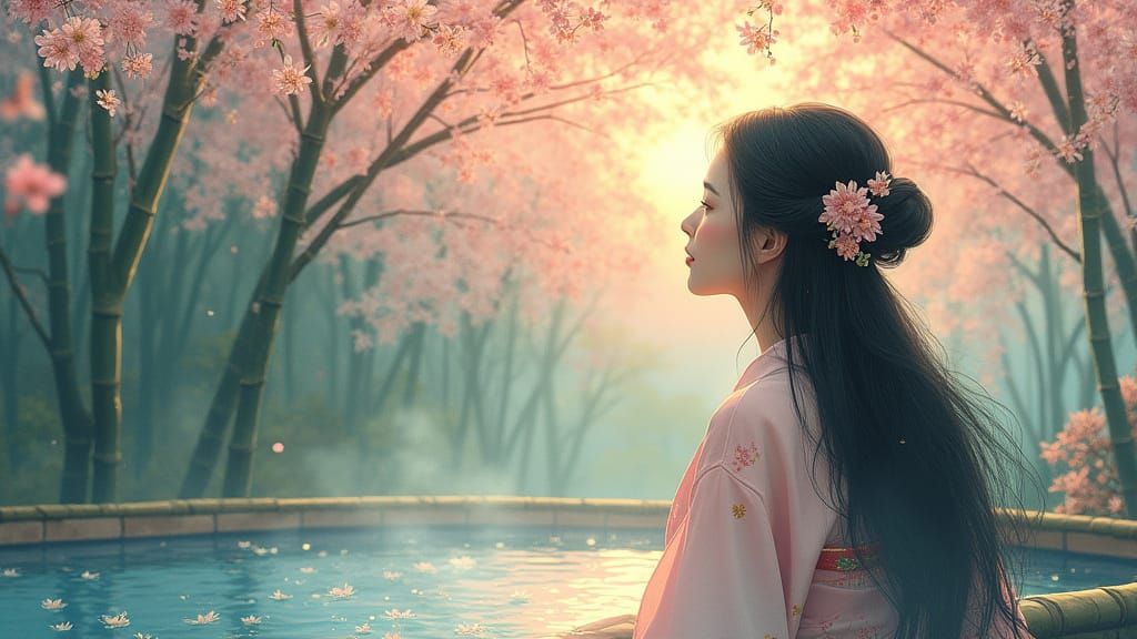 This image captures a peaceful Japanese garden scene at dawn, with delicate cherry blossoms falling onto a steaming onsen. A beautiful young woman gazes serenely at the sunrise, surrounded by dew-kissed bamboo groves, in a traditional ukiyo-e woodblock print style.