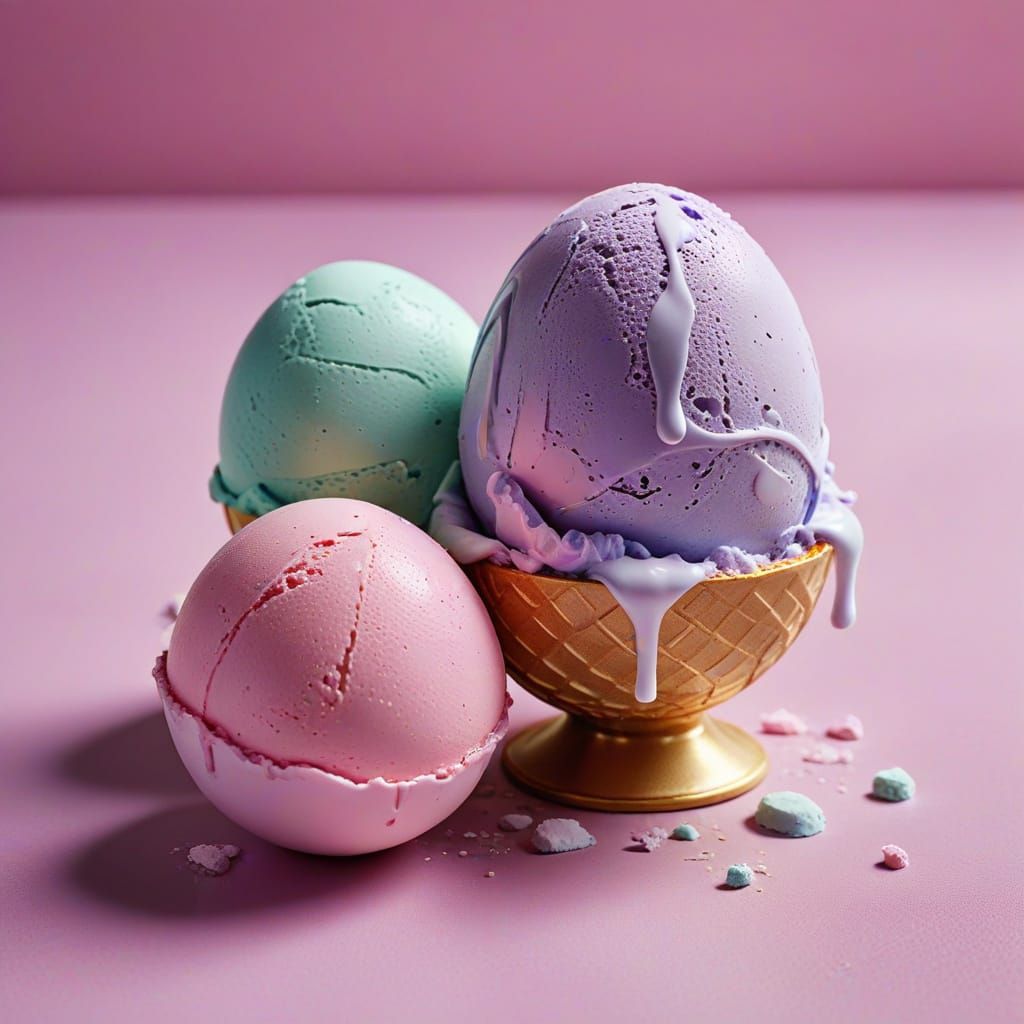 This image showcases a whimsical still life of abstract egg designs, surrounded by pastel-colored ice cream and dessert treats, radiating sweetness and morning charm.