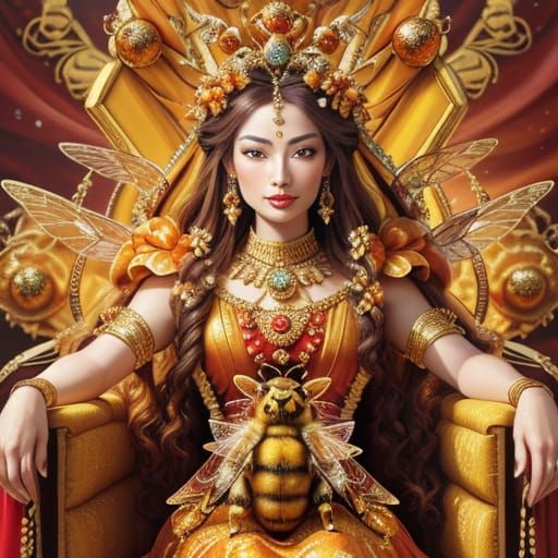 A striking picture of a giant honey bee dressed as a goddess, enthroned in vibrant red and orange. The image is a macro photograph with realistic textures and intricate patterns in an oil painting style.