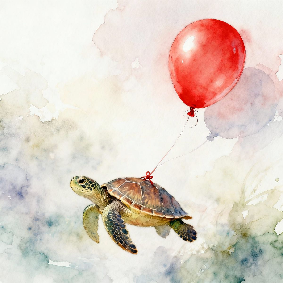 This image shows a turtle tethered to a red helium balloon, gently floating against a soft, dreamy watercolor background. The artwork captures a whimsical and serene scene.