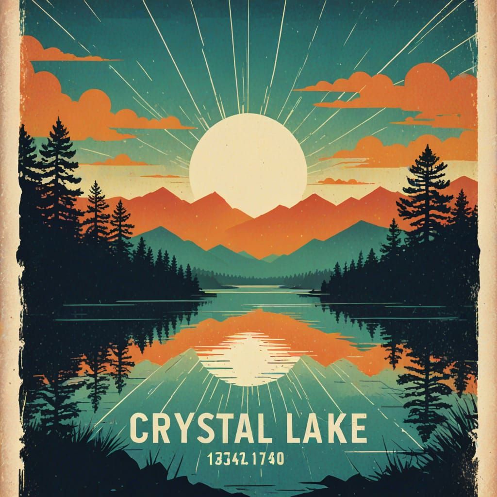 This image shows a sunrise over a pristine lake. The artwork evokes a mid-century poster with halftone textures, bold typography, and a limited color palette for a nostalgic effect.