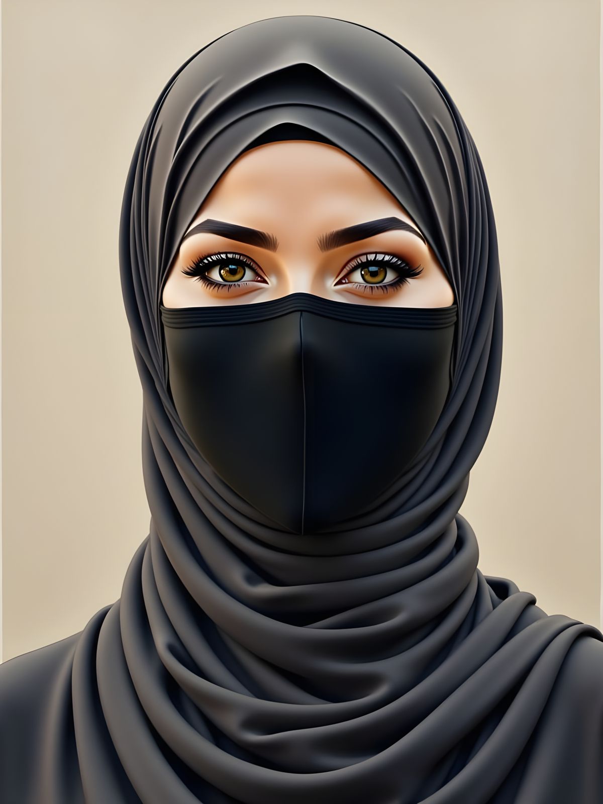 This image shows a head and shoulders portrait of a beautiful European woman. She is wearing a dark grey hijab and a simple facemask. The image has a painterly aesthetic.