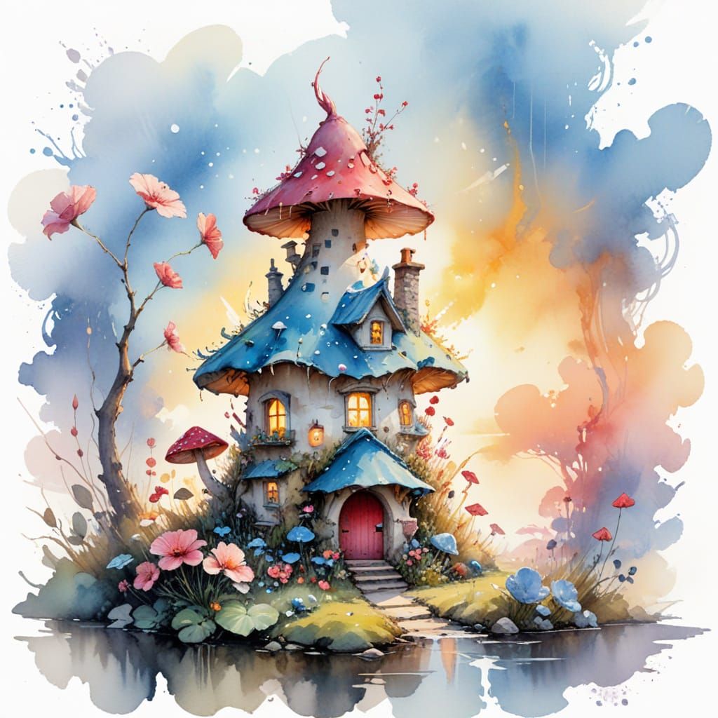 This image shows a small dragon curled around a mushroom house at dawn. It features a pastel watercolor palette with soft blues, yellows, and whites, accented by a ruby-spotted roof and glowing smoke.