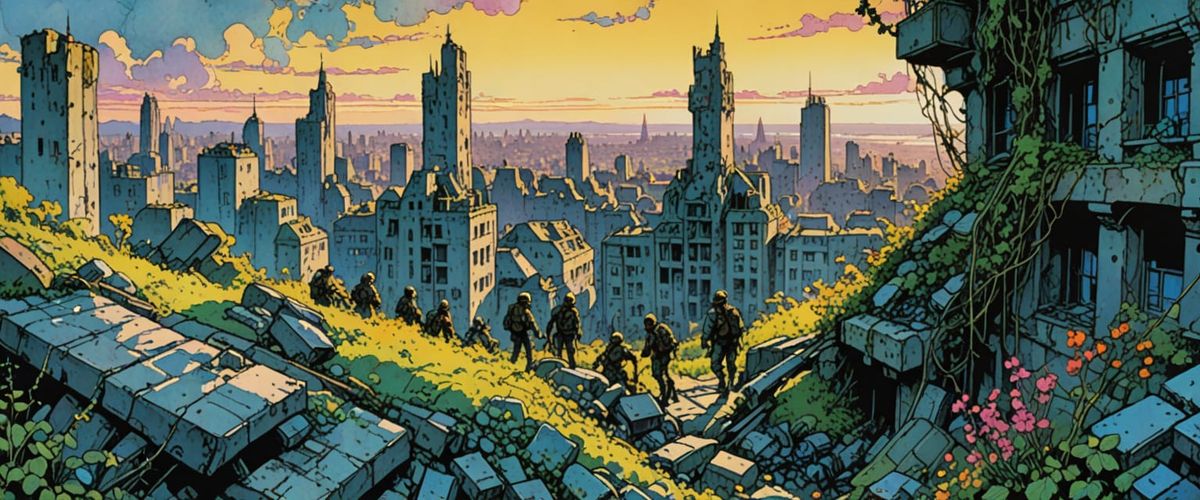 A vibrant scene of soldiers amidst the ruins of a modern city overtaken by nature. Overgrown skyscrapers and abandoned buildings are painted in watercolor and gouache with volumetric lighting, in a comic book style.