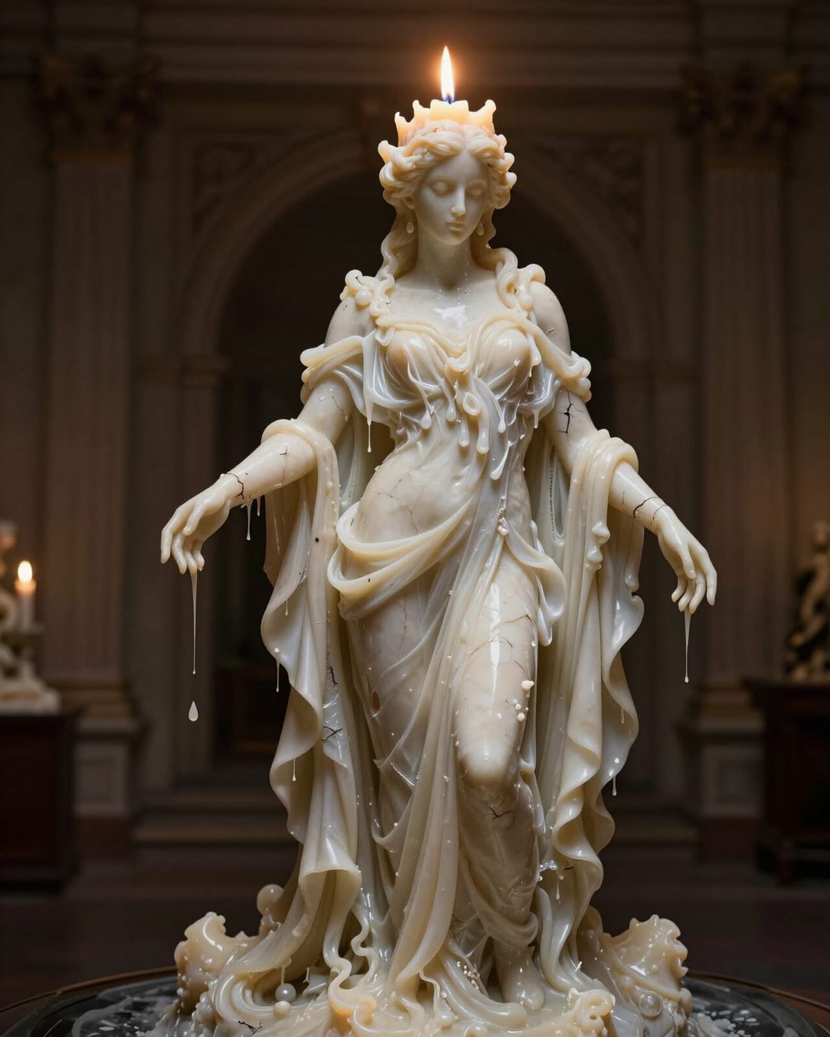 This image depicts a hyper-realistic sculpture of a high-fashion figure made from molten candle wax, frozen mid-drip in a dark, elegant void. Cinematic lighting highlights its beauty and fragility.