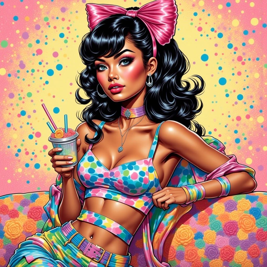 This image shows a vibrant, cartoon-style woman with rainbow hair in a polka dot, striped, and checkered outfit, reminiscent of vintage comic book art using Ben-Day dots.