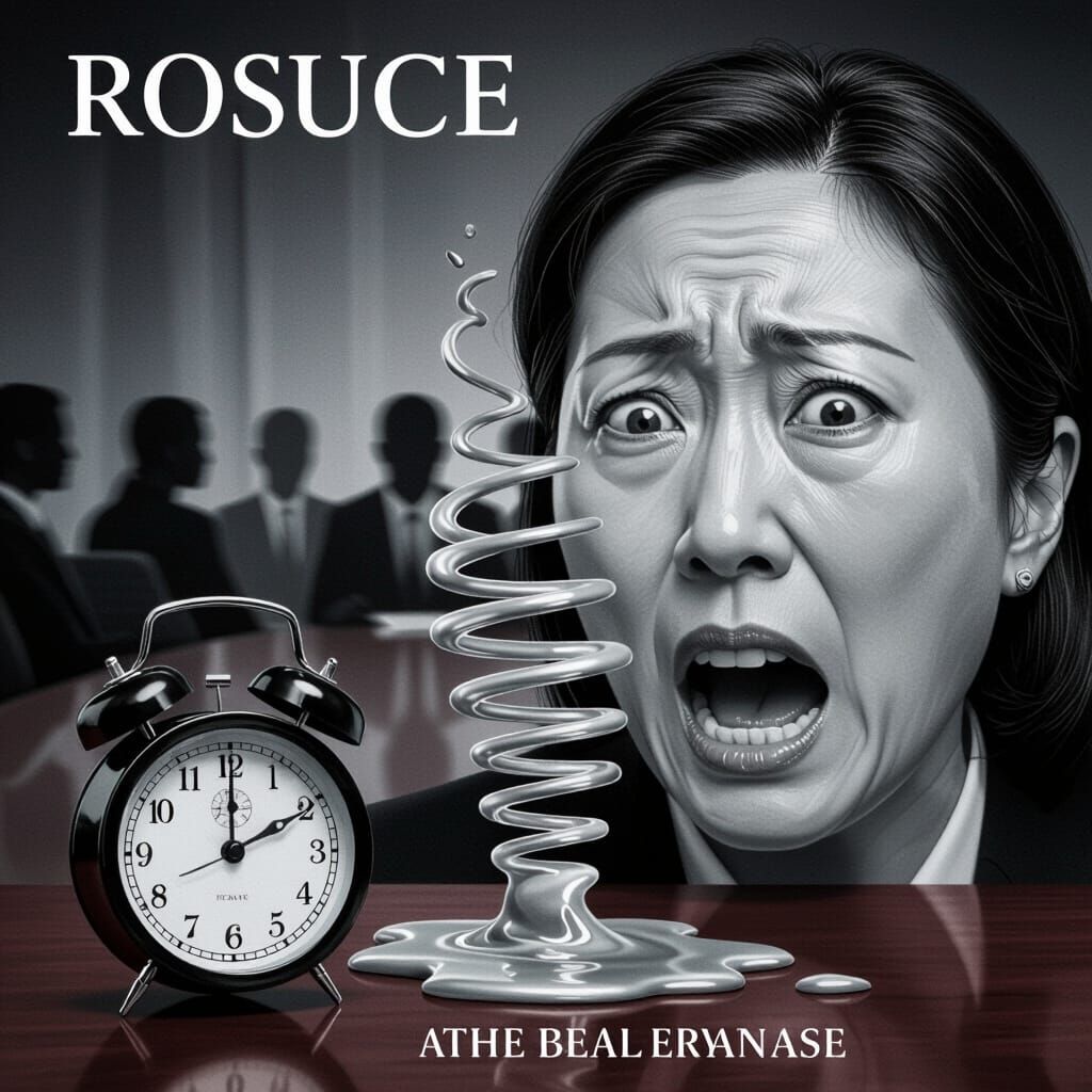 This hyperrealistic charcoal sketch depicts a diverse East Asian woman's face in a silent scream of corporate frustration, fixated on a melting clock. Dramatic contrast and shadows enhance the surreal, detailed scene.