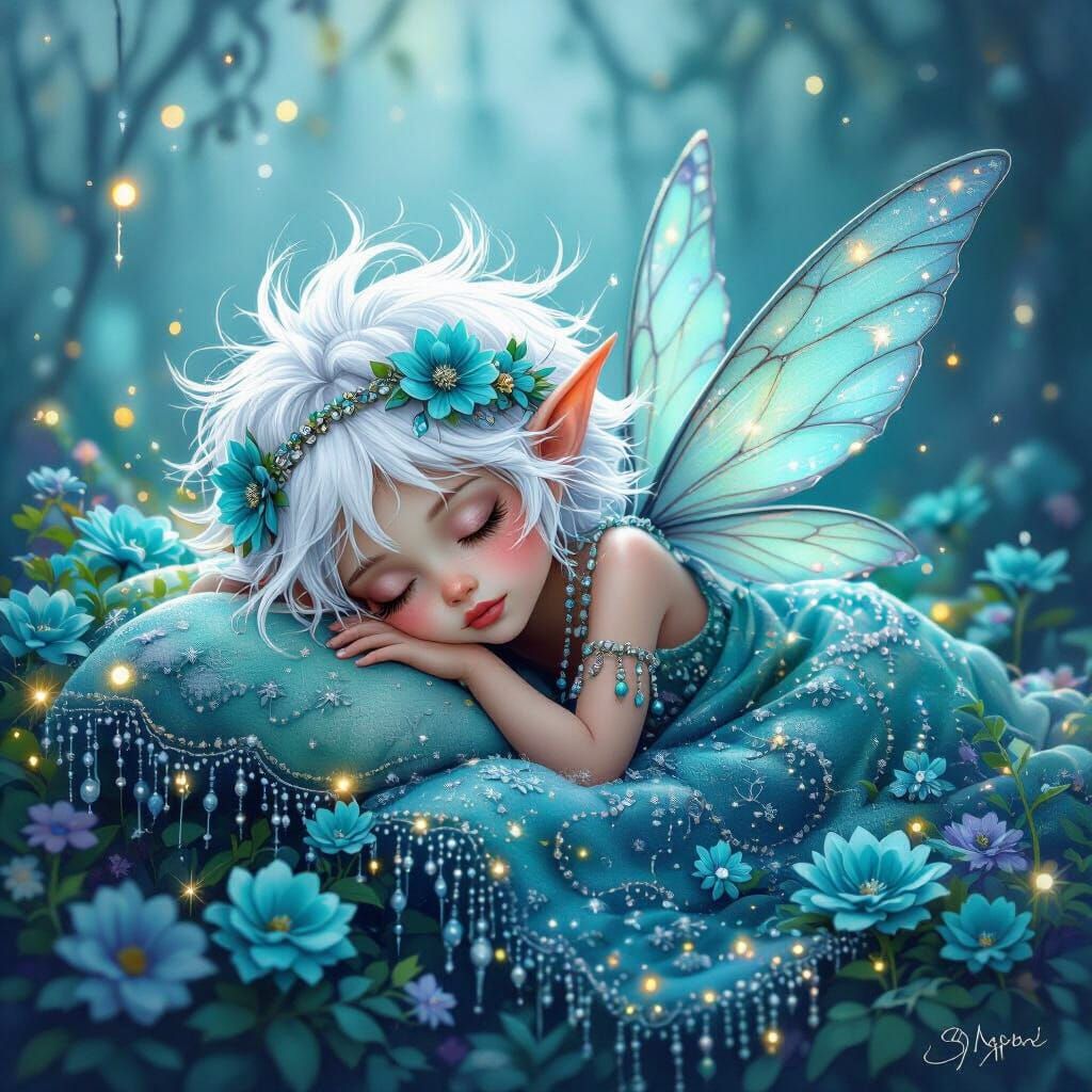 This image shows an adorable, hand-drawn fantasy art pixie sleeping peacefully on a bed of flowers, covered by a beaded blanket. Features luminous lighting and watercolor textures.