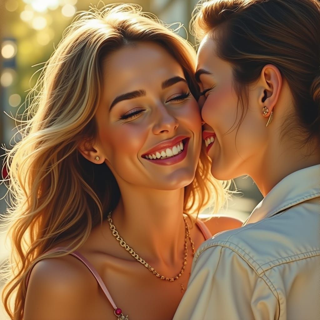 This image depicts three women in a warm, joyful embrace. Bathed in golden hour light on a city street, the scene features vibrant colors and a romantic atmosphere, rendered in a whimsical watercolor style.