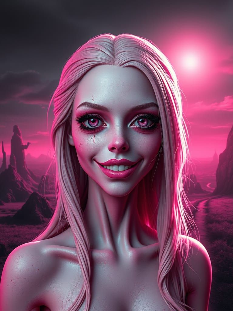 A surreal portrait of a woman with an unsettling smile set against an alien landscape. The image features body horror elements and is rendered with pink hues under alien sunlight.
