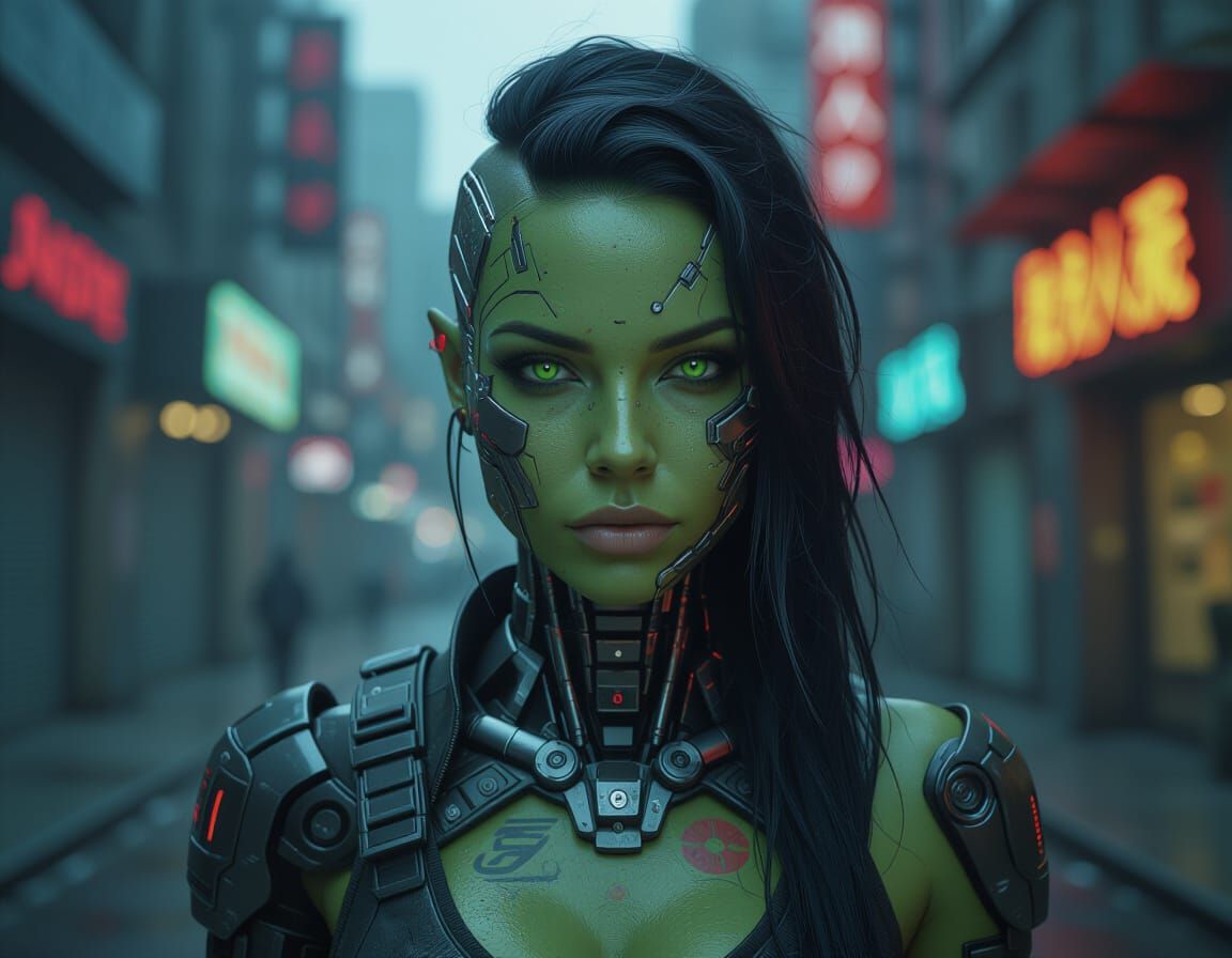 A hyperrealistic portrait of a green-skinned half-orc cyborg woman with cybernetic implants. She stands in a gritty, neon-lit dystopian future city, captured with cinematic lighting.