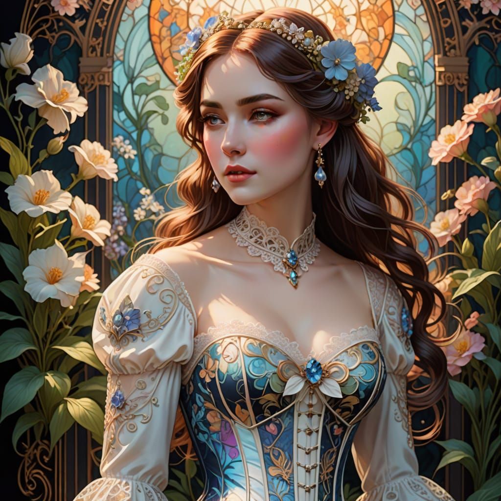 This image shows a young woman in a dreamy, colorful Art Nouveau scene. With porcelain skin and delicate features, she wears a stunning white corset with intricate lace trim, set against a vibrant, floral background reminiscent of Alphonse Mucha's style.