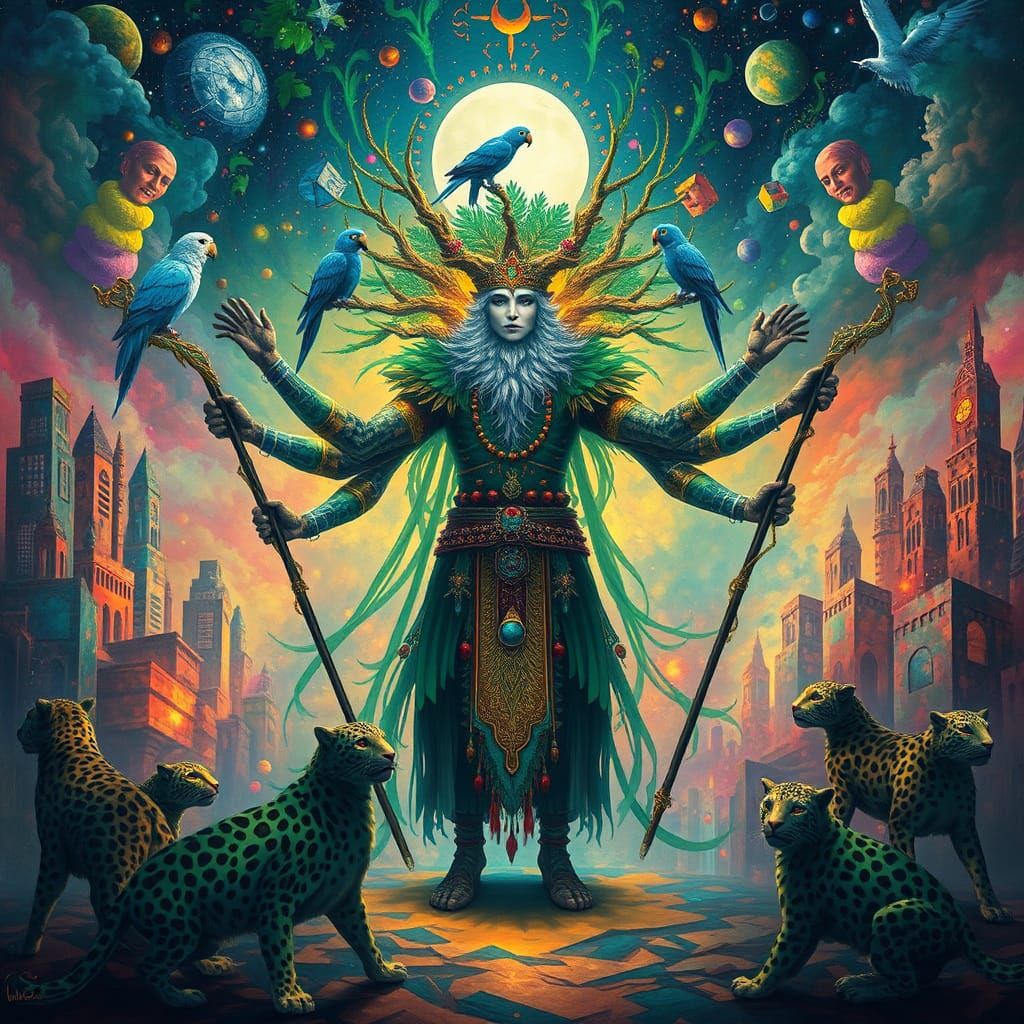 A surreal image shows a shaman-like figure with multiple arms holding elemental staffs, surrounded by colorful leopards, in a city of light. His daughter, a blue parrot, sits on his head in this surrealistic scene.