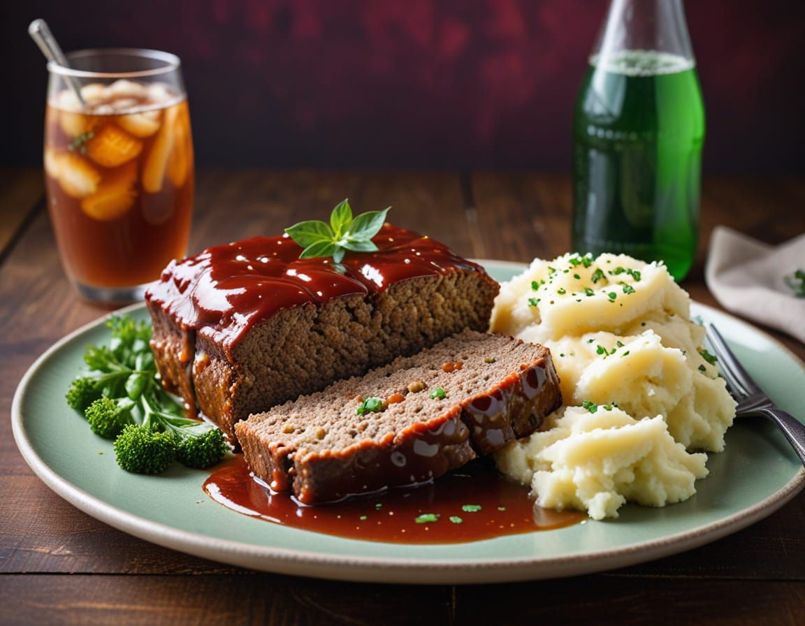 This mouthwatering image captures a still life of juicy meatloaf, creamy mashed potatoes, and fresh herbs, served with a glass of sparkling green soda and garnished with a side of applesauce. Shot with softbox lighting and vibrant colors, this appetizing food photography is sure to satisfy your cravings.