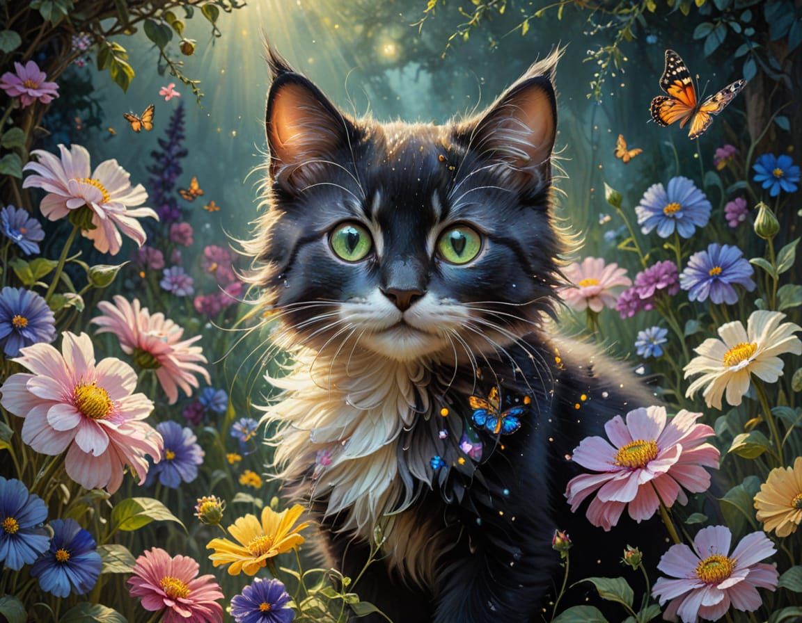This enchanting painting depicts a black kitten chasing a colorful butterfly amidst a vibrant garden filled with dahlias, pansies, and cosmos flowers. The artwork features rough, textured brushstrokes and a warm, muted color palette with pops of bright colors, evoking a dreamy atmosphere reminiscent of c...