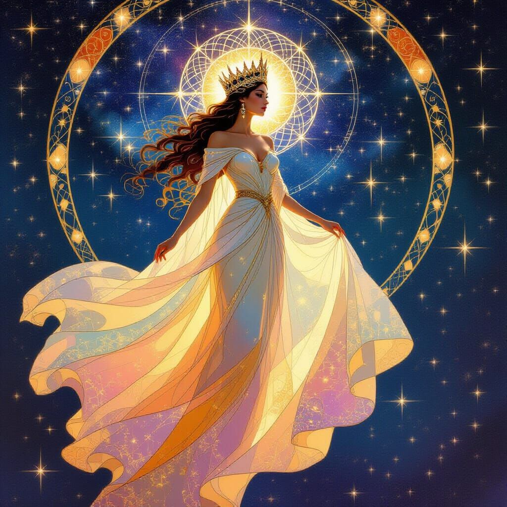 This image depicts a majestic queen floating amidst stars, adorned with a constellation crown and a glowing gown. The art style is inspired by opulent, decorative fantasy, featuring nebulae and stardust.
