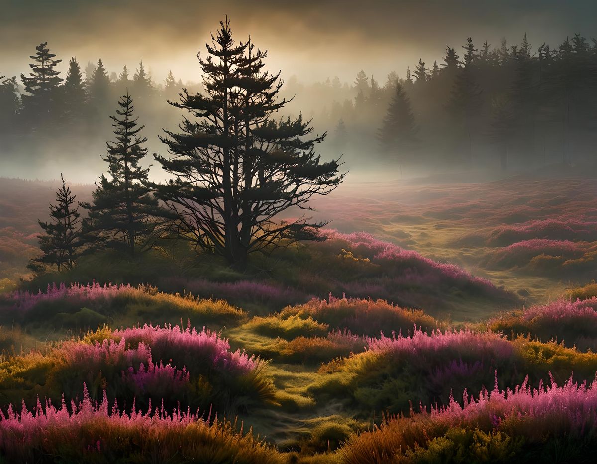 A serene landscape featuring blooming heather shrouded in morning mist. The artwork showcases intricate details and entangled elements, reminiscent of dark comic book art.