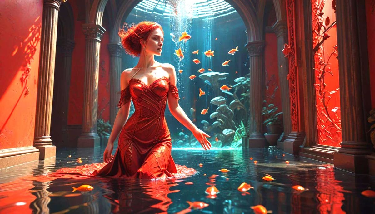 This is a hyperrealistic image of a woman with crimson hair and eyes, looking into a mirror in her palace. The artwork features intricate details and a vibrant crimson color palette, presented in a CGI caricature style.