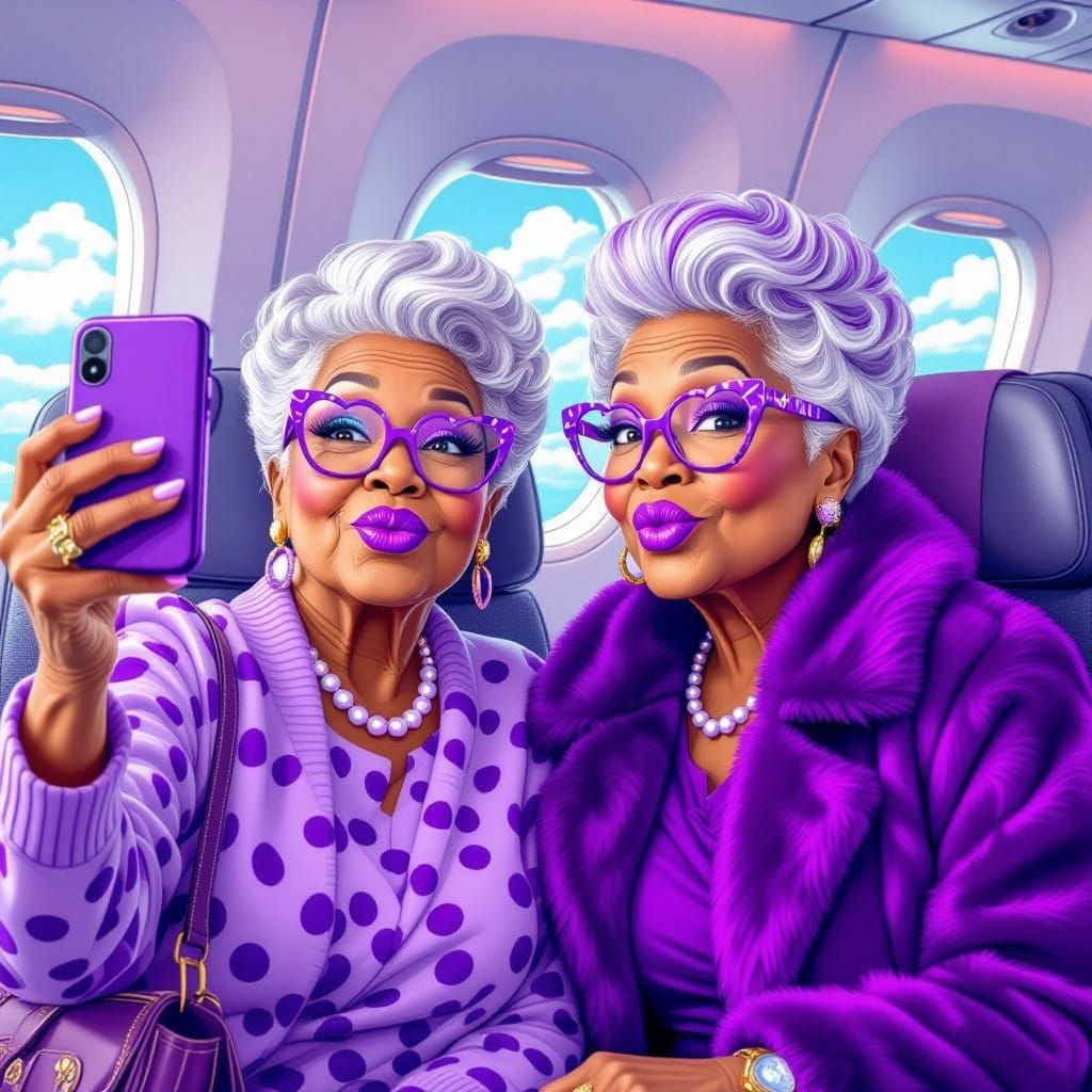 This image shows two stylish, plus-size African-American women in their sixties taking a selfie on an airplane with a purple smartphone. The cartoon-like scene is colorful and humorous.