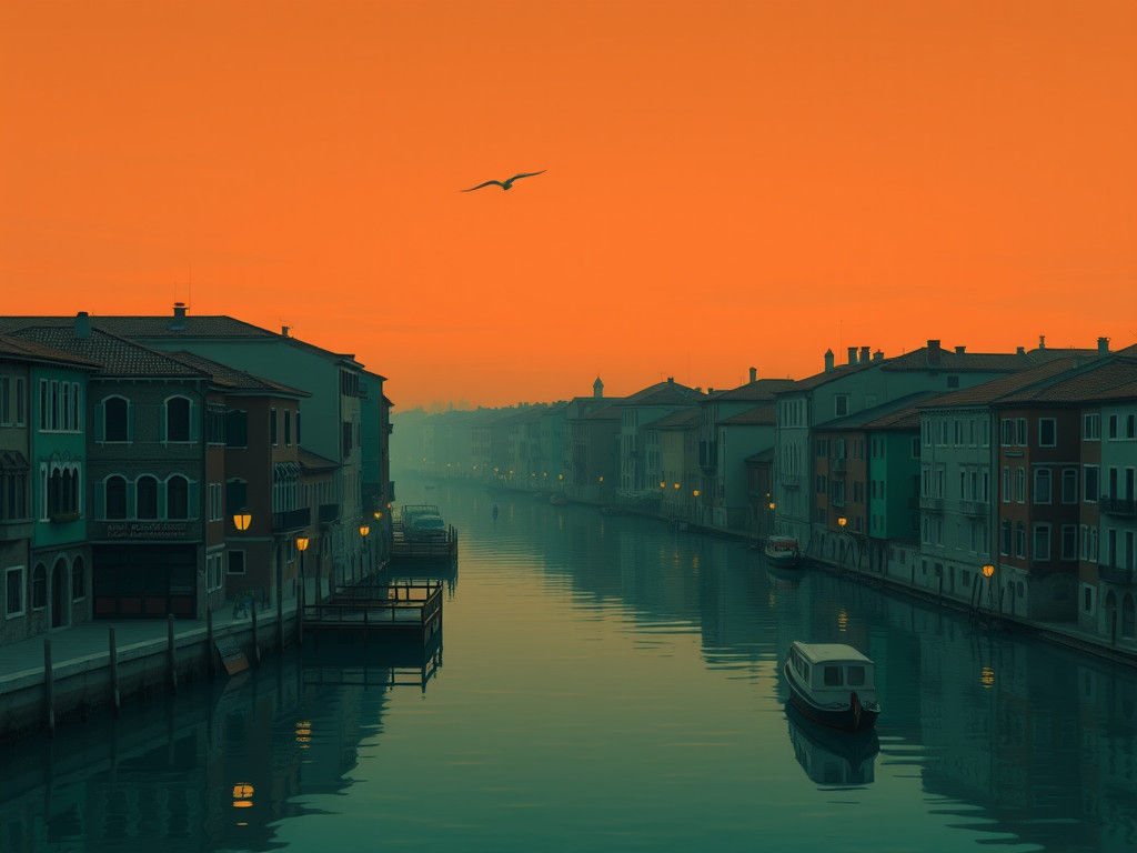 This image shows a minimalist dark academia scene with bright orange and dark green hues. The artwork evokes Studio Ghibli and Canaletto in a ultraminimal aesthetic.