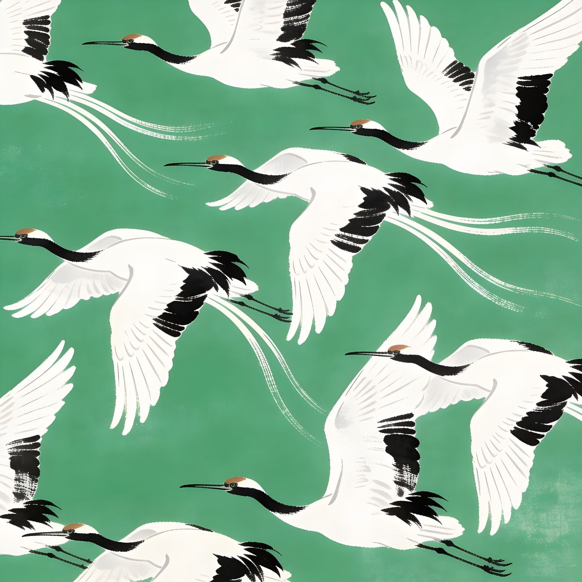This image showcases flying white cranes against a green backdrop, rendered in a minimalist printmaking style with meticulous brushwork and elegant use of negative space.