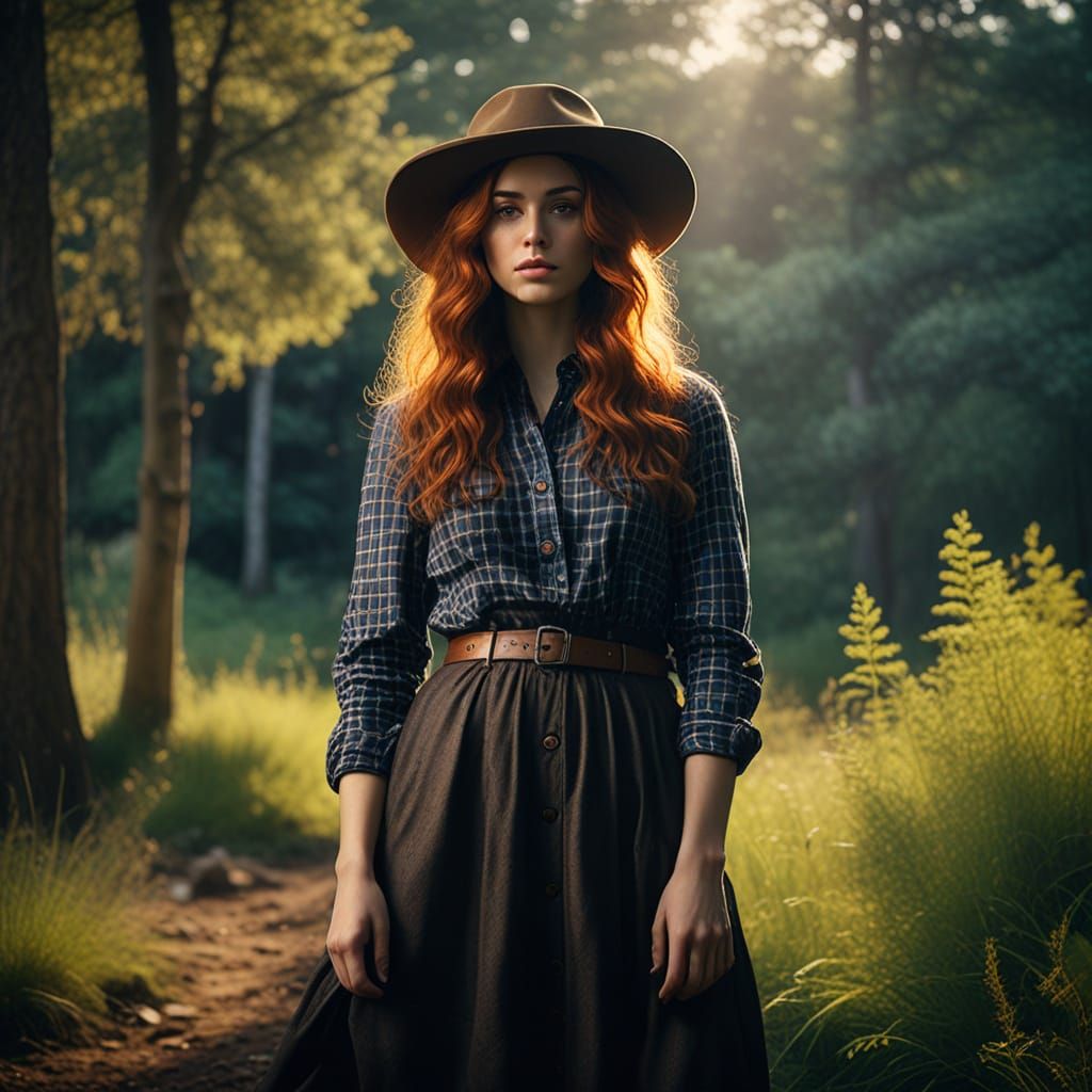 A full-length portrait of a cowgirl in a detailed leather-trimmed dress and checked shirt, set against a lush prairie background. Rendered with painterly strokes and rich textures, evoking classic art.