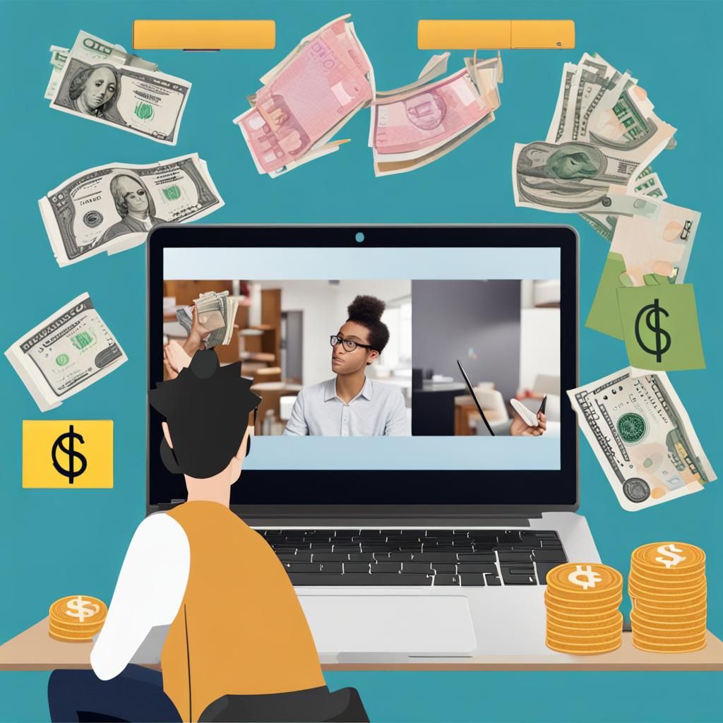 This image shows a collage representing a student balancing studies and freelance work to earn money. The collage includes a student, a laptop, and a cash symbol.