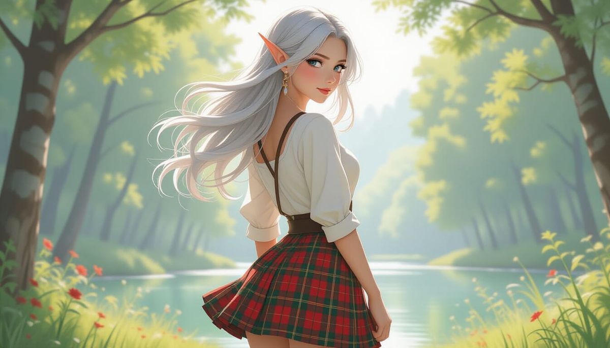 A beautiful elf woman with silver hair, seen from behind, wears a tartan skirt and white blouse. Captured in a realistic style with natural lighting.