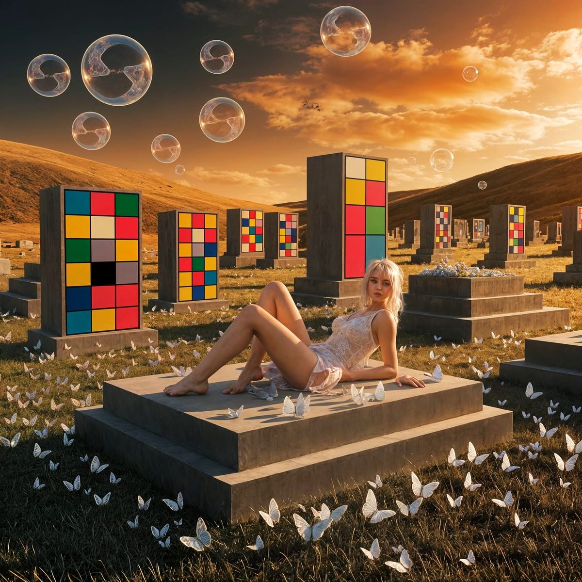 A photograph depicting a surreal and captivating graveyard bathed in the golden hues of late afternoon sunlight, inspired by the aesthetics of H.R. Giger with a dark pastel color palette. Geometric, Mondrian-inspired tombstones in vibrant, unexpected colors punctuate the scene, while playful, Miro-esque ...