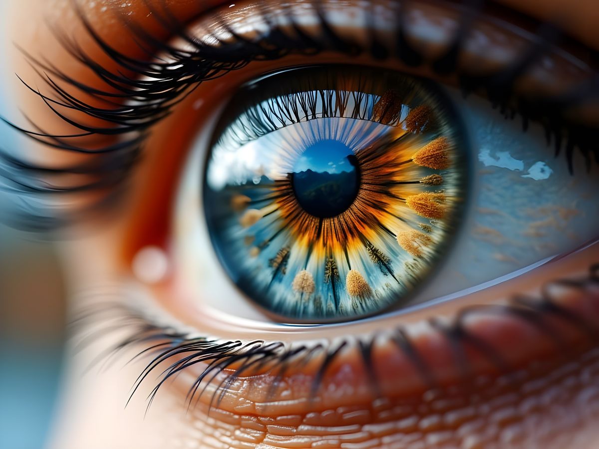 A hyperrealistic macro photograph capturing a woman's eyeball, reflecting a vibrant autumn mountain lake scene with stunning color depth and dramatic lighting.