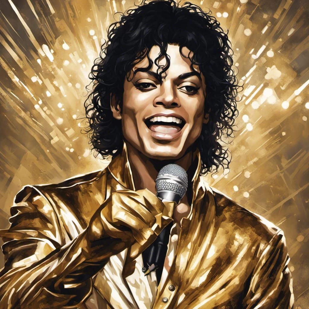 This image shows Michael Jackson performing on stage in his gold History tour costume. The portrait features dynamic lighting, intricate details, and a vibrant color palette.