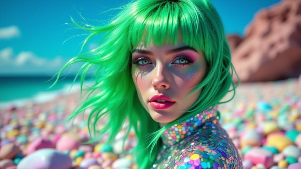 A striking picture of a woman with neon green hair on an opal beach. The hyperrealistic digital art features shimmering diamond skin and an iridescent gown, blending fantasy and photorealism.