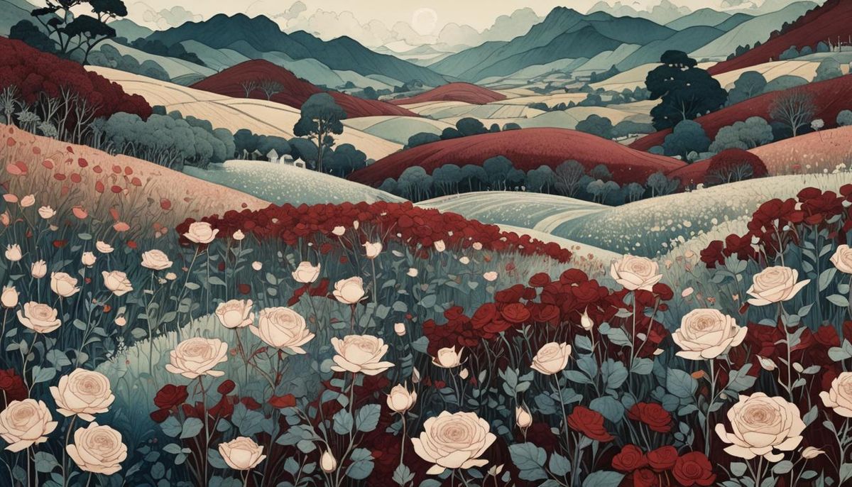 This image depicts cyanotype landscapes featuring rose fields in silver and maroon tones. The artwork is highly detailed, reminiscent of illustrative art.