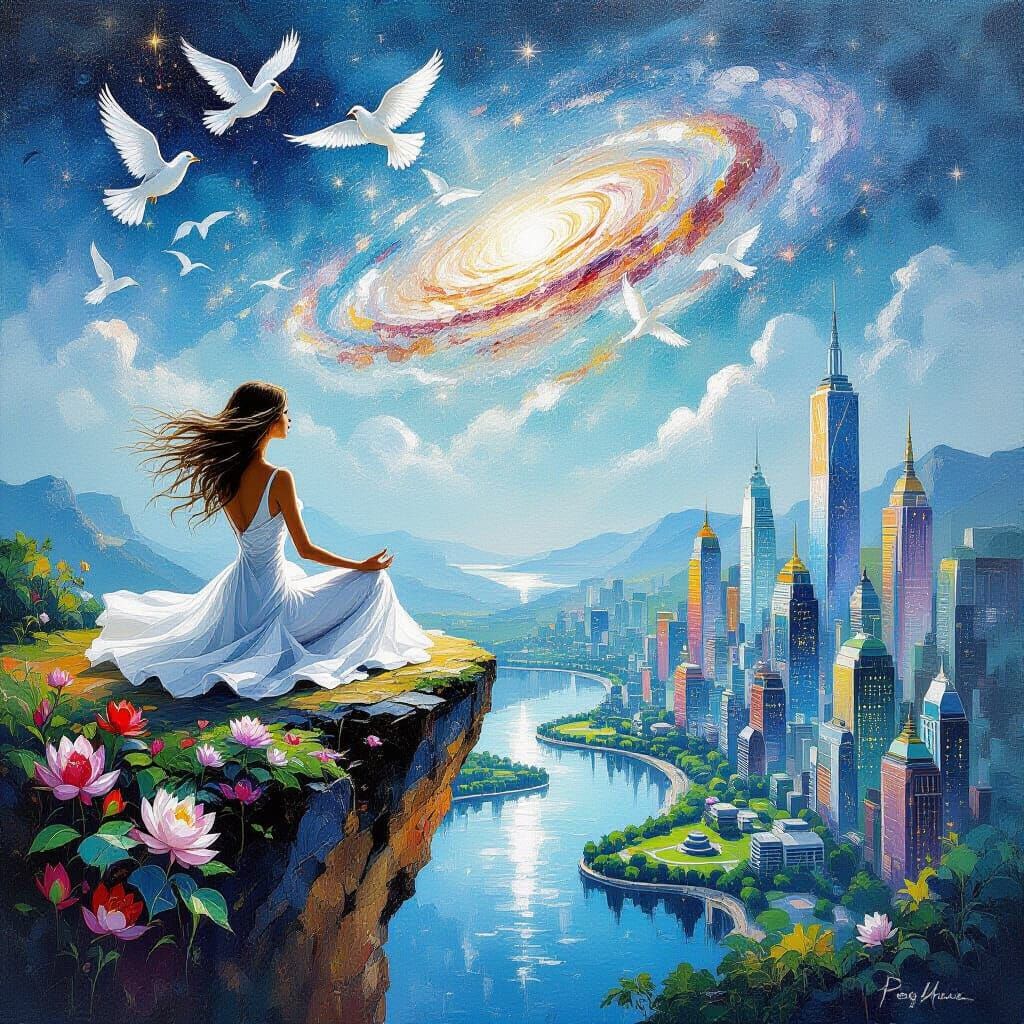 This image shows a woman in a flowing white dress meditating on a cliff's edge, surrounded by cosmic lights and a futuristic city below. Painted in an impressionist, impasto style with bold brushstrokes.