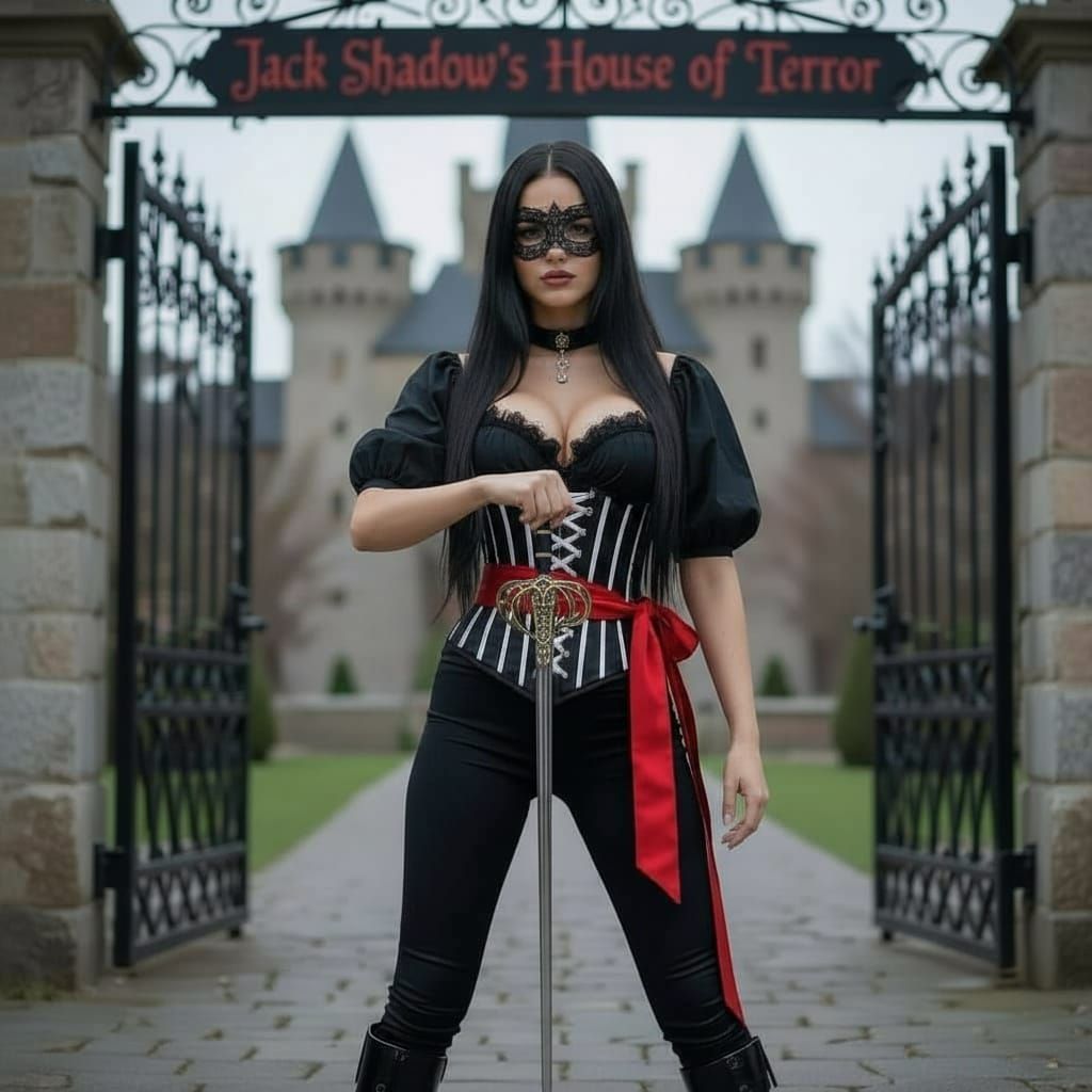 A striking image of a Latina woman in a corset and boots, holding a rapier. She stands before wrought iron gates leading to a medieval castle called "Jack Shadow's House of Terror."