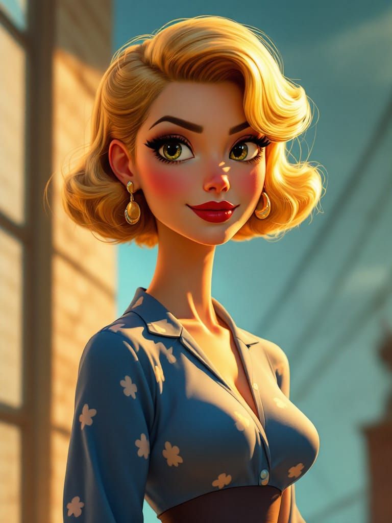 This image features a full-body depiction of a 1950s pin-up woman with bold eye contact. The style combines character design with cinematic lighting for a warm, dimensional look.