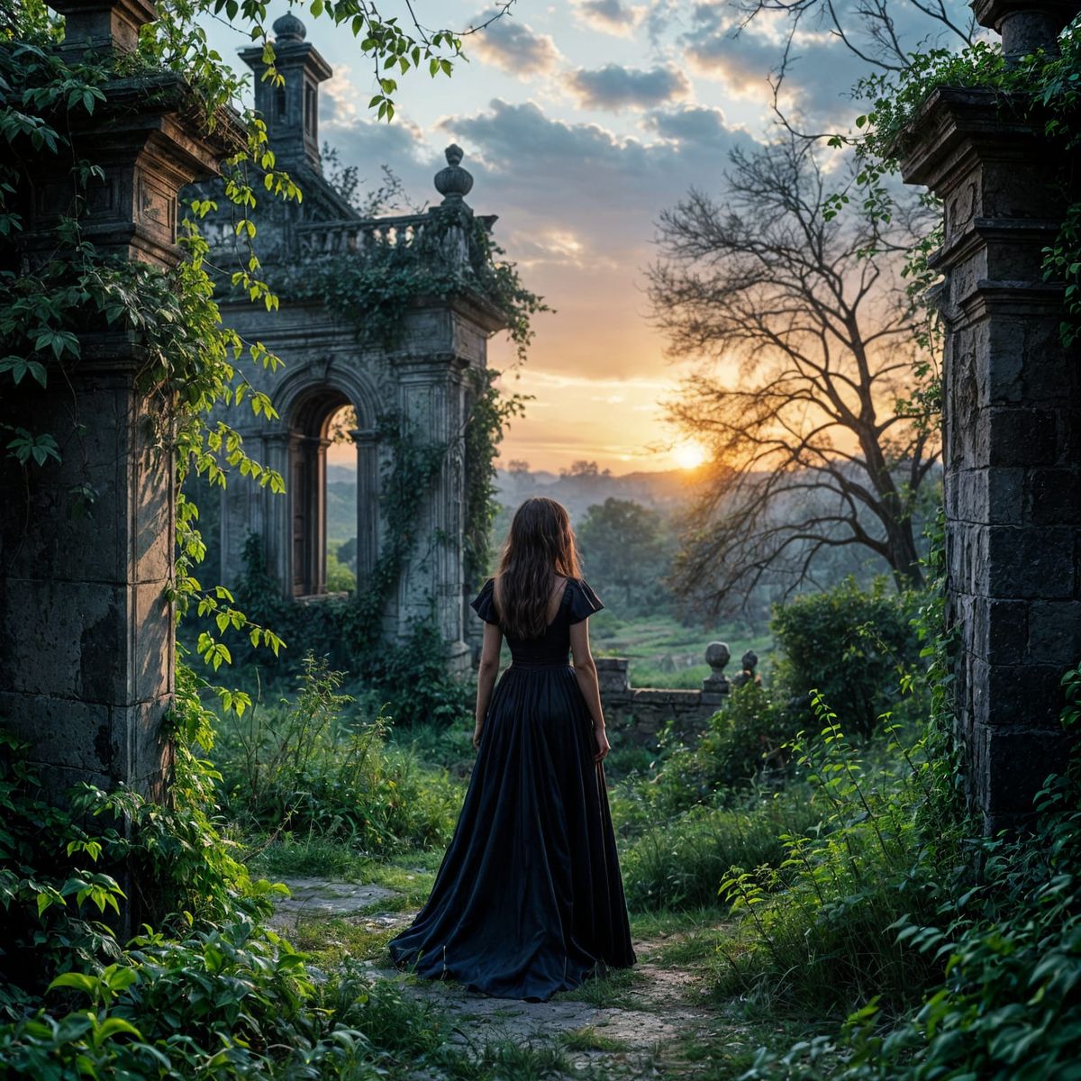 This image shows a solitary woman on the edge of a decaying, vine-covered estate during a dramatic sunset. The scene evokes suspense with its vintage glamour and cinematic realism.