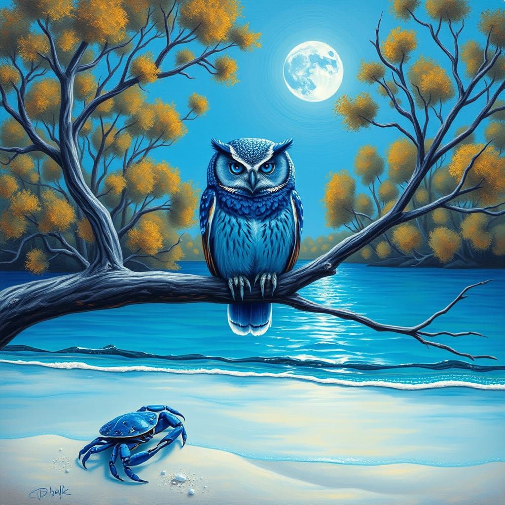 A striking picture of a cobalt blue owl perched on a branch, its large eyes glowing. The surrounding trees are rendered in warm blue tones, reminiscent of tonalist paintings.