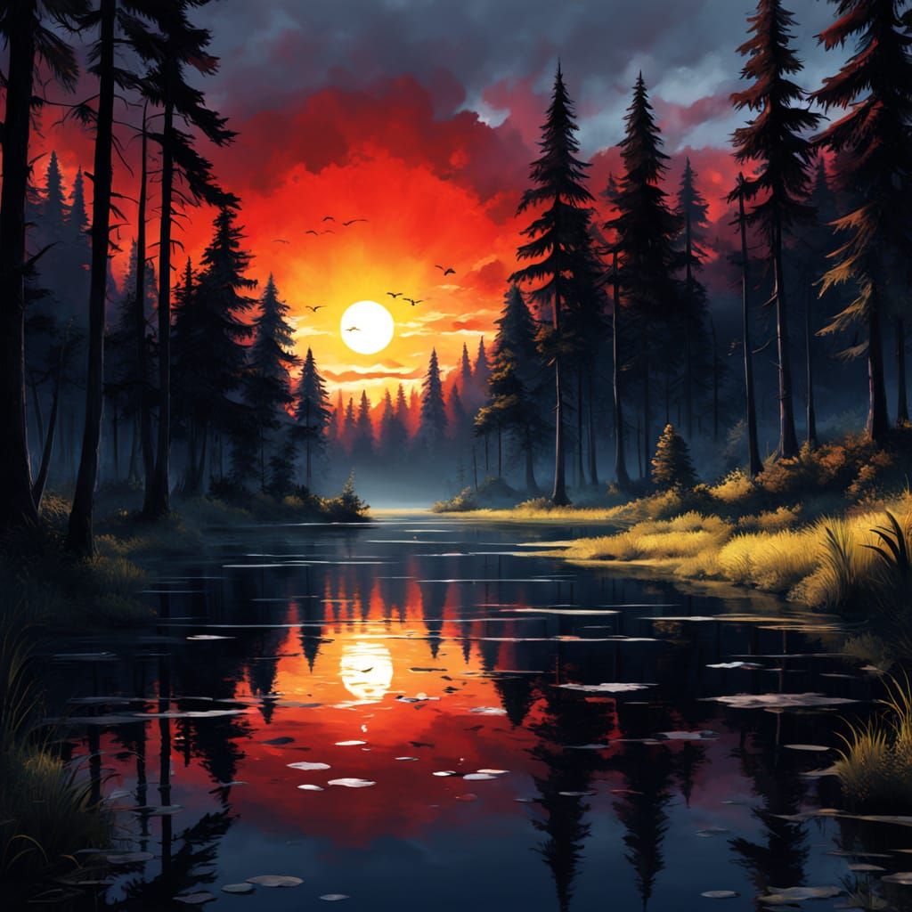 A dramatic sunset over a gothic forest lake. The image features blood-red skies, silhouetted trees, and deep shadows in a hauntingly beautiful watercolor and oil painting.