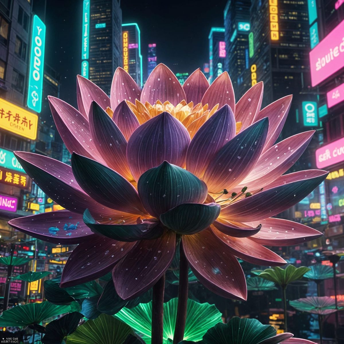 This striking image captures a lotus flower in bloom, its neon-lit petals glowing amidst a futuristic city's vibrant holographic advertisements. The scene is bathed in cinematic lighting, showcasing intricate details and vivid colors.