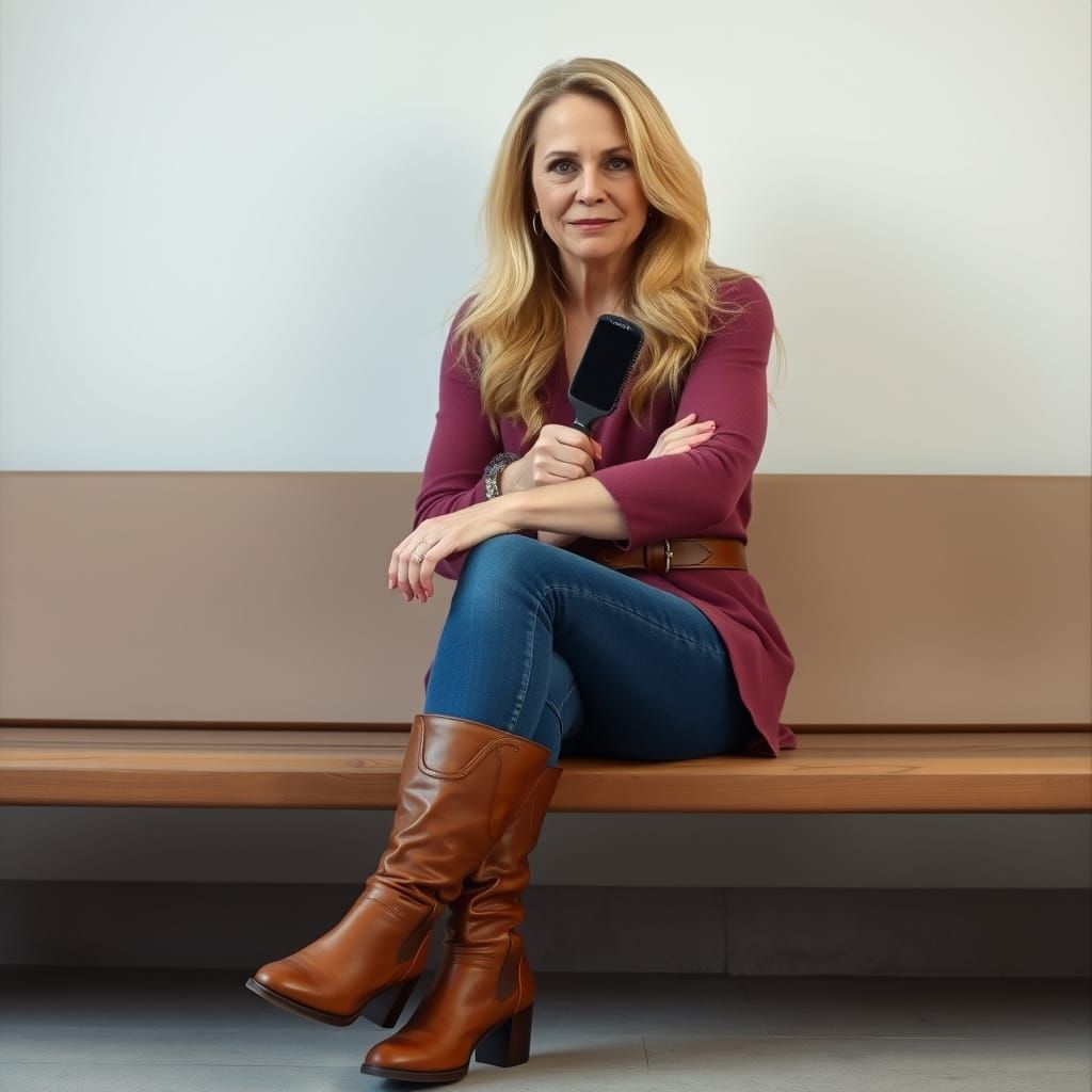 A photorealistic image of a mature woman with long blonde hair sitting on a bench. She wears blue jeans, a brown belt, and boots, holding a hairbrush, rendered with hyperrealist detail.