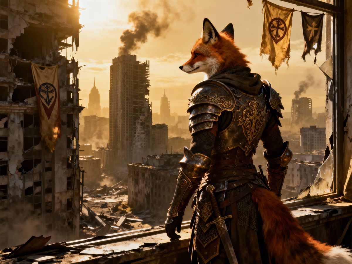 An anthropomorphic fox warrior in armor gazes over a desolate, post-apocalyptic city. Dramatic lighting and hints of a lost past evoke a dark fantasy concept art style.