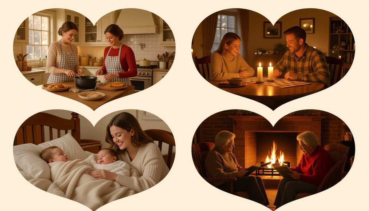 This image presents four heart-shaped scenes of cherished family activities, rendered in a hyper-realistic, warmly lit style with painterly touches. It evokes a timeless, comforting holiday atmosphere.