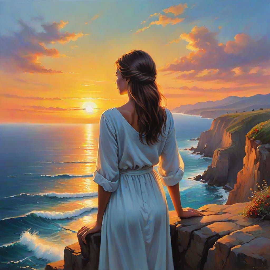 A striking picture of a woman gazing at a sunset over the ocean from a cliff. This hyper-realistic oil painting uses layered colors and dramatic lighting to create depth.