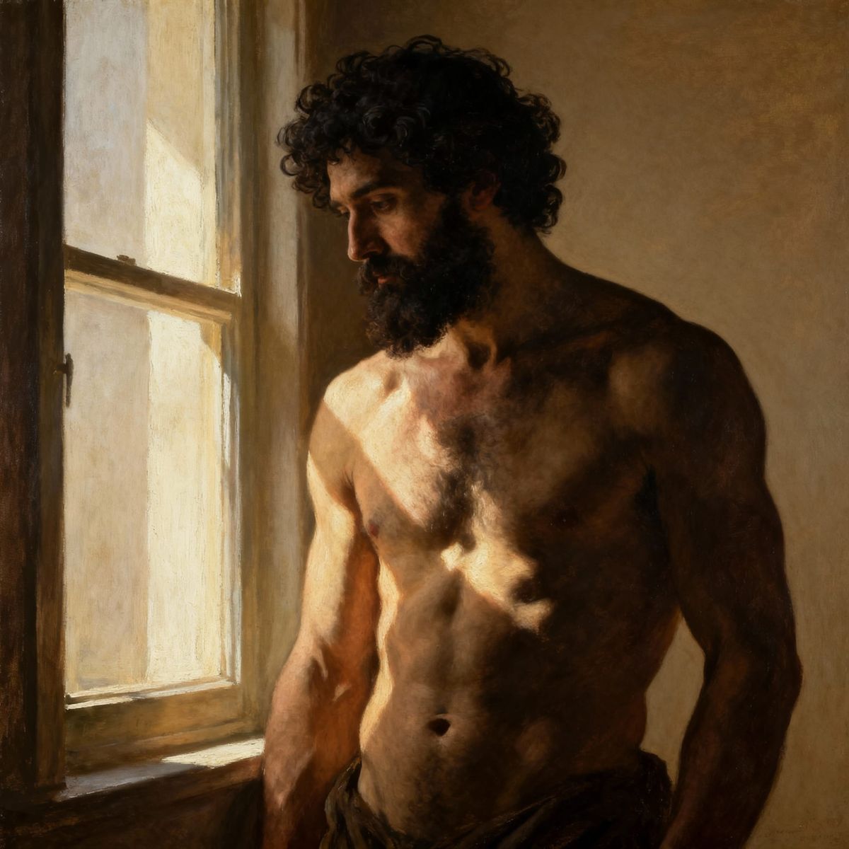 This image shows a contemplative, muscular man with a beard near a window, bathed in natural light. Rendered in an oil painting style with dramatic chiaroscuro and earthy tones, it emphasizes quiet strength and emotional realism.